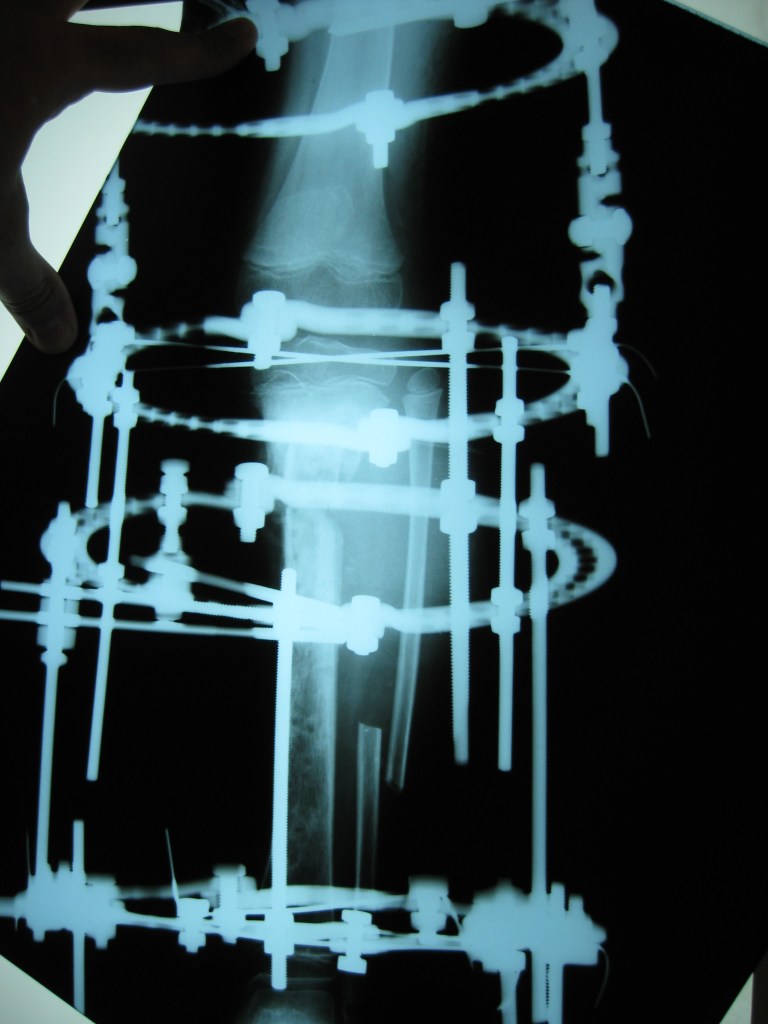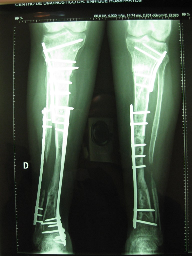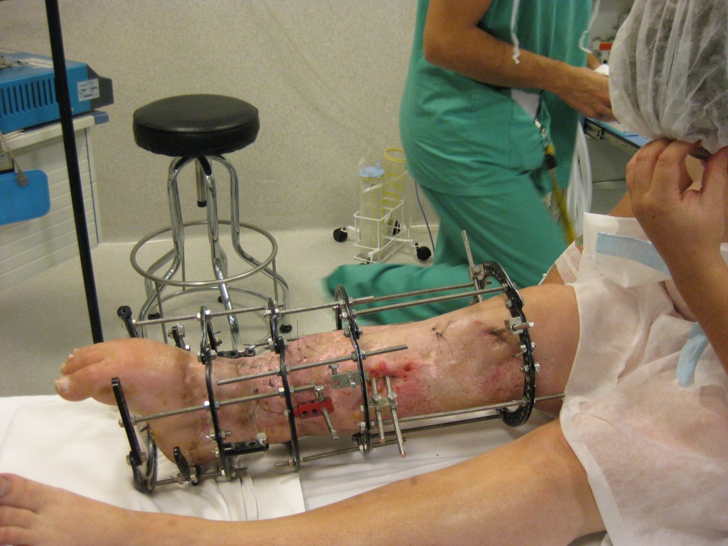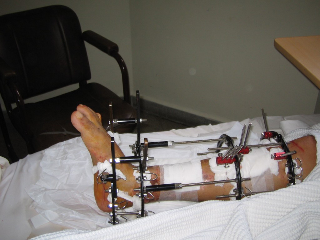 Luego de una 1 cirugía que consistió en remover todo el tejido muerto y acortar el hueso , pudimos tratar la infección ,y en una 2 cirugía alargar la pierna nuevamente