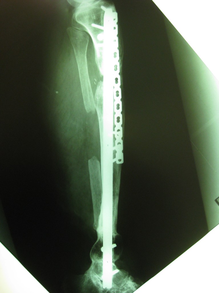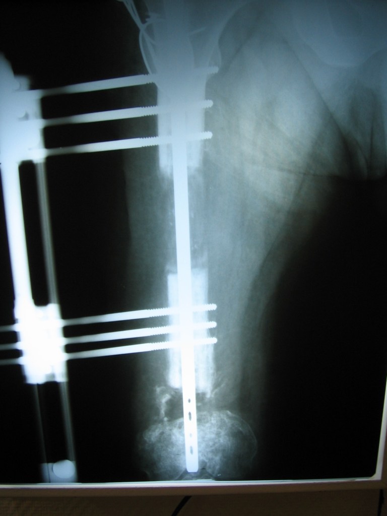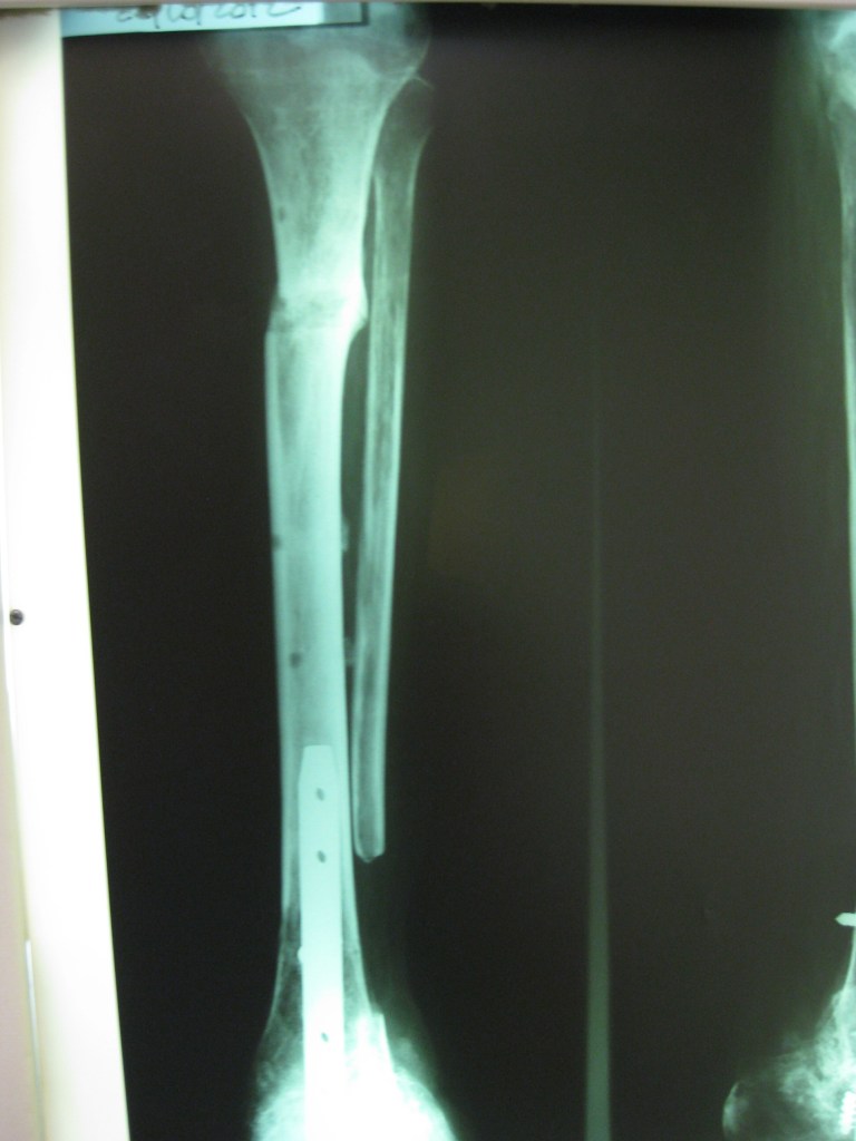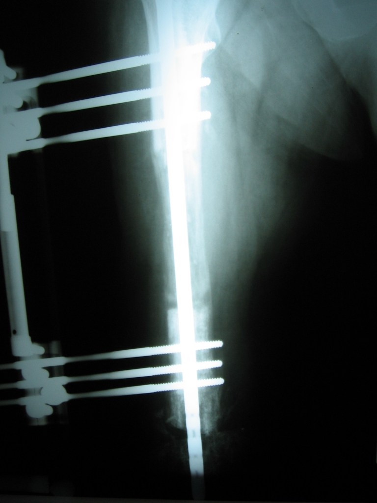 Luego de una 1 cirugía que consistió en remover todo el tejido muerto y acortar el hueso , pudimos tratar la infección ,y en una 2 cirugía alargar la pierna nuevamente